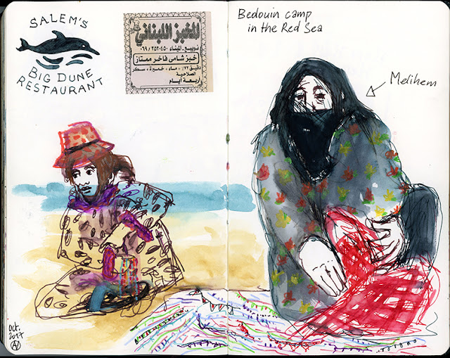 Finally we did it ! 7 years I haven't been there and I found the place unchanged. A bedouin camp in the city of Neweiba. Bangalows near the beach, the coral bareer, the colorfull fishes, an amazing view on the mountains of Jordan on the other side of the Red sea, few families to play with my kids, the perfects ingredients for me to sketch !